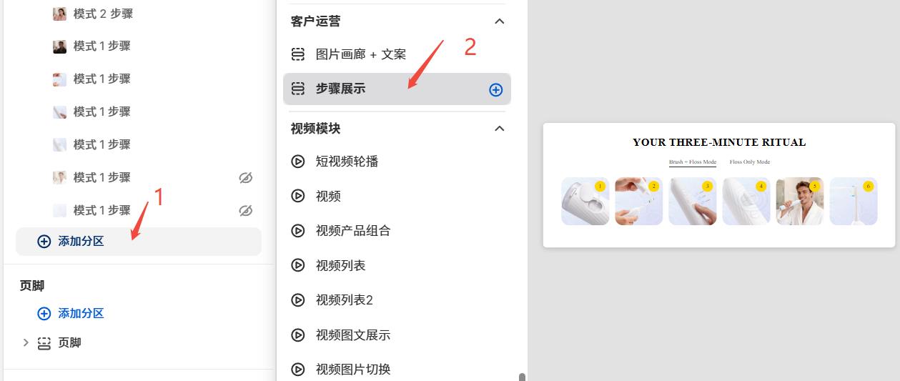 进入装修页面,如下图点击添加分区,在客户运营下面找到步骤展示,点击添加